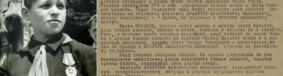 През юни 1944 година с орден «Червено Знаме» е награден 13-годишният Костя Кравчук — най-младият негов притежател. По време на фашистката окупация на Киев, рискувайки живота си, той спасил знамената на 968 и 970 стрелкови полкове.